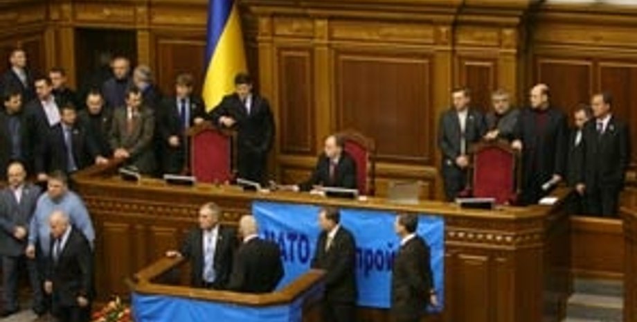 Напомним, сегодня с утра фракция Партии регионов заблокировала трибуну и президиум Верховной Рады. На трибуне президиума вывешен лозунг "НАТО не пройдет!". Председатель Верховной Рады был заблокирован на своем рабочем месте в президиуме.