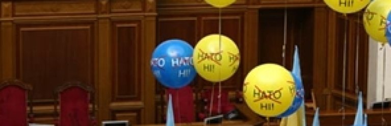 В сессионном зале размещены воздушные шарики с надписью "НАТО нет" и флаги Украины.