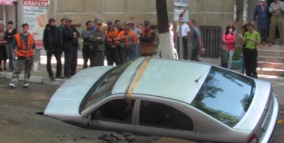 Под проезжей частью проходит водопроводная труба, ее прорвало, вода размыла землю и машина провалилась левым бортом под землю. Водитель не получил существенных травм, сообщает objectiv.tv.