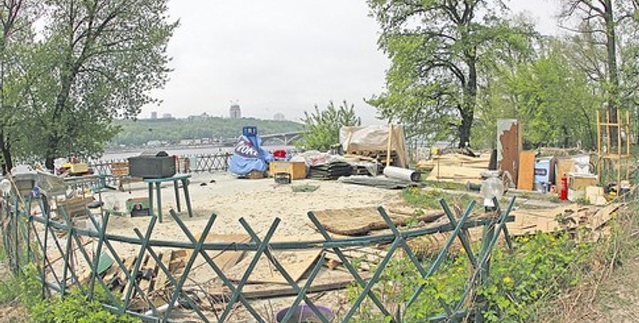 На пляжах близ моста Патона еще во время прошлой проверки обнаружили бетон с приготовленными металлоконструкциями. Тогда замглавы КГГА Михаил Кучук распорядился в течение трех дней все убрать. Но все осталось на месте, более того — забетонированный пляж засадили по периметру елками.
