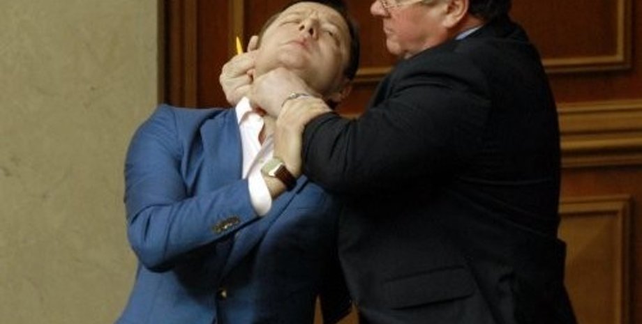 Мартынюк схватил Ляшко за шею и потянул на себя, таким образом, перекинув Ляшко через боковую дверцу президиума. "Он его сильно схватил. У Ляшко была красная шея", - сказал очевидец.