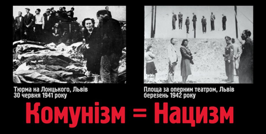 На биллбордах размещены две фотографии: жертв коммунистического и нацистского режимов – казнь людей 30 июня 1941 года в Тюрьме на Лонцкого и расстрел в марте 1942 года возле Львовского национального академического театра оперы и балета.