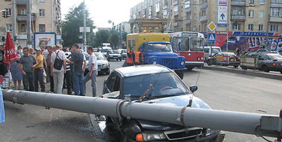 Вчера вечером в центре Житомира на перекрестке улиц Киевской и Восточной упал столб и раздавил легковой автомобиль "Дэу"