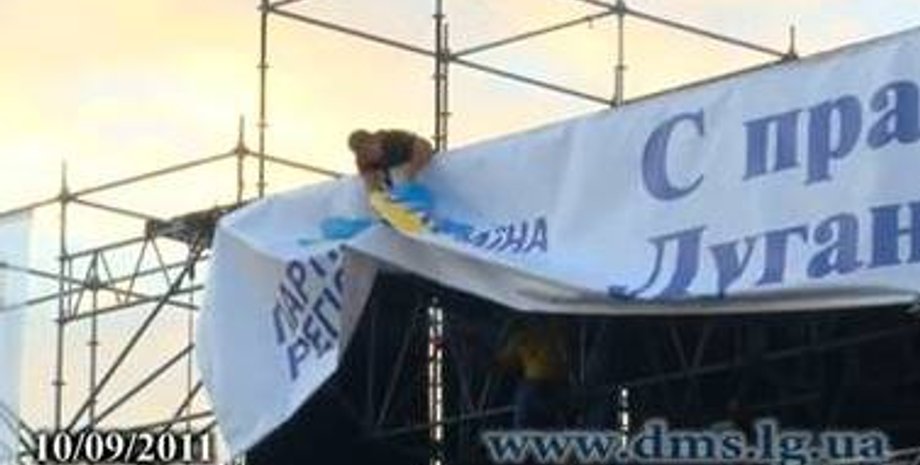 В субботу, 10 сентября, в Луганске во время концерта по случаю дня города с баннера над сценой отрезали слова "Партия регионов"