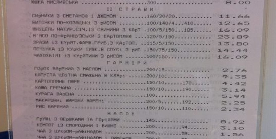 Так, из меню следует, что депутат, посетивший парламентскую столовую, может плотно покушать домашней солянкой, любительским салатом и натуральным шницелем с картошкой всего за 30 грн. 46 коп. Кроме того, на десерт можно взять компот за 3 грн. 10 коп. и сырники за 12 грн. 65 коп.