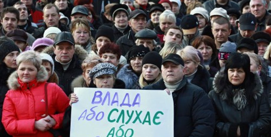 Как передает корреспондент УНИАН, участники акции держат флаги с партийной символикой ВО "Свобода", "Батьківщина", Народного Руха Украины, Конгресса украинских националистов, "Фронту Змін"; красные карточки с изображением Президента Украины и надписями: "Не хами. Не свисти", а также плакатами с надписями: "Чи винні жителі Донбасу?" и "Геть!".