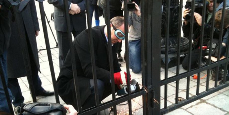 Народный депутат от НУ-НС Андрей Парубий срезает при помощи болгарки металлический забор, установленный вокруг здания Верховной Рады Украины