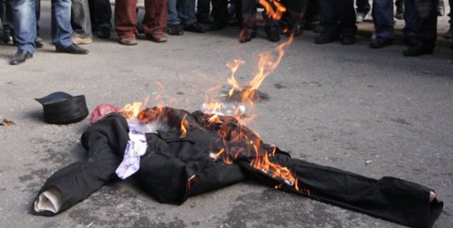 Кроме того, протестующие сожгли чучело, символизирующее Джемилева. Резиновая кукла была одета в костюм и галстук, а на месте головы находился листок бумаги с изображением лидера Меджлиса. До этого оппозиционеры также посадили чучело в инвалидную коляску, символизируя тем самым недееспособность лидера Меджлиса.