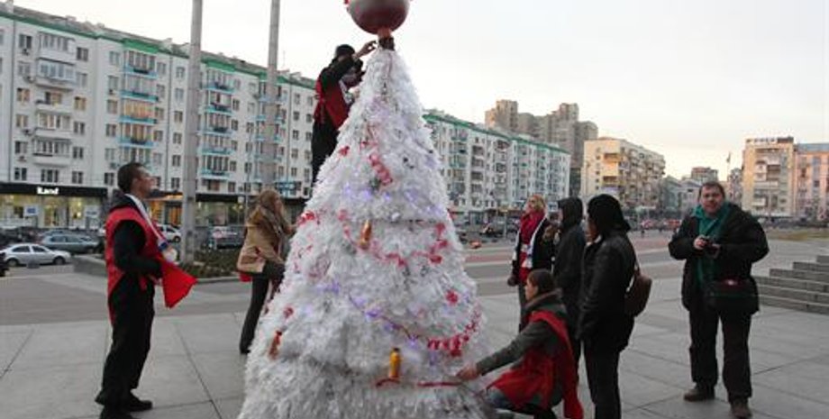 В понедельник, 5 декабря, возле станции метро Дворец Украина активисты установили новогоднюю елку, собранную из продуктов вторсырья