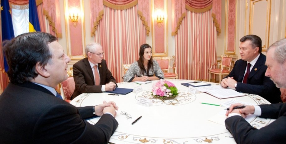 В Киеве продолжается встреча президента Украины Виктора Януковича и лидеров Европейского Союза - президента Совета ЕС Хермана ван Ромпея и президента Европейской комиссии Жозе Мануэля Баррозу