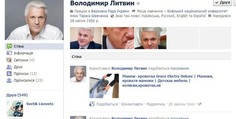 Вчера вечером страницу главы Верховной рады Владимира Литвина на Facebook атаковали хакеры