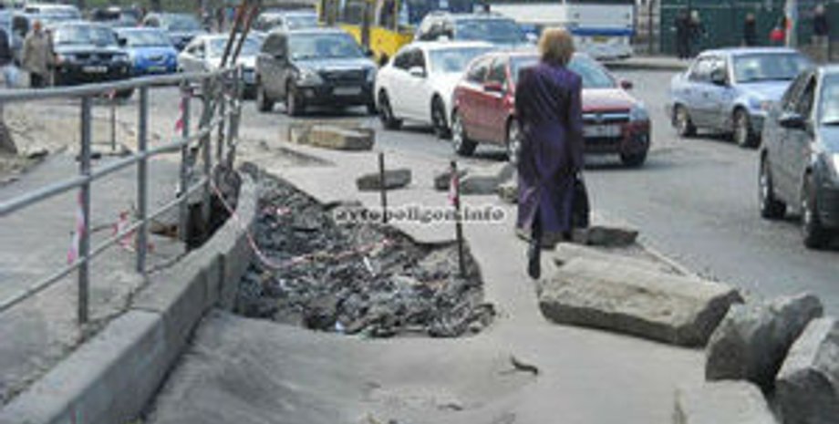 Коммунальная корпорация "Киевавтодор" объясняет провал части тротуара у станции метро Васильковская прорывом коммуникационных сетей.