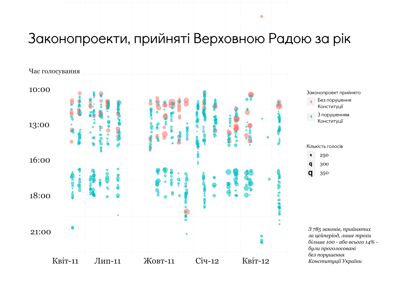 Авторы исследования прошлой осенью обработали 18 500 законопроектов за период 2008-2009 и 2010-2011 годы. Как выяснилось, скорость принятия законопроектов Президента и Кабмина выросла в 2,5 раза, в первую очередь из-за того, что депутаты активно голосуют чужими карточками. Таковы результаты исследования, проведенного в рамках проекта Тексты.