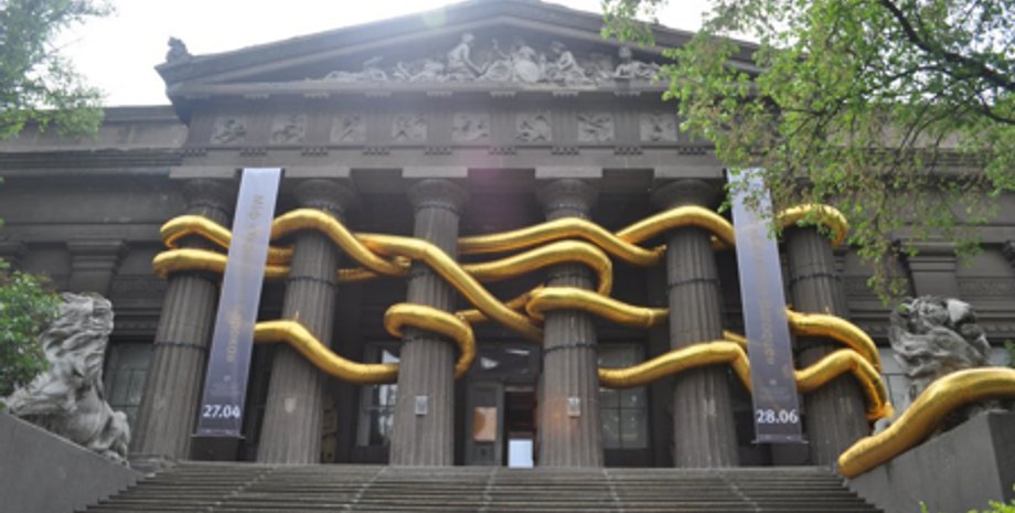 Напомним, 18 мая фасад здания Национального художественного музея был украшен золотыми трубами.