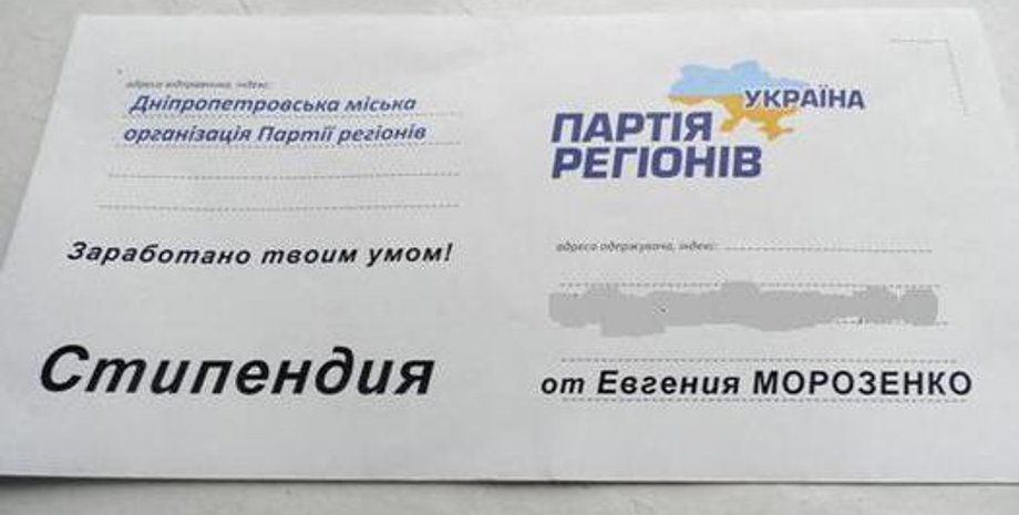 На конвертах в качестве отправителя значилась "Днепропетровская городская организация Партии регионов", от Евгения Морозенко. Размер стипендии составил 50 гривен.