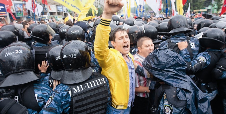 События 5 июня многим собравшимся напомнили будни оранжевой революции. Громкие лозунги против действующей власти, насквозь промокшие и замерзшие люди, пронзительные крики в толпе "Милиция с народом!". Но, как и в ноябре 2004 года, стражи порядка от обычных украинцев были далеки. С самого утра 2800 правоохранителей плотным кольцом окружили парламент и бело-голубой митинг сторонников власти. Их еще ночью организованно начали свозить в Киев десятки автобусов. Благодаря опеке силовиков одетые в синие дождевики гости столицы, преимущественно из восточных регионов страны, чувствовали себя уверенно, но от общения с журналистами наотрез отказывались. "Мы своих детей, своих женщин, которые у нас за спиной, готовы защищать", — заслоняя суровых молчаливых соратников, заявил местный житель — киевлянин Алексей Филиппов. Его воинственный задор со сцены подогревает скандально известный экс-нардеп от ПР Олег Калашников.