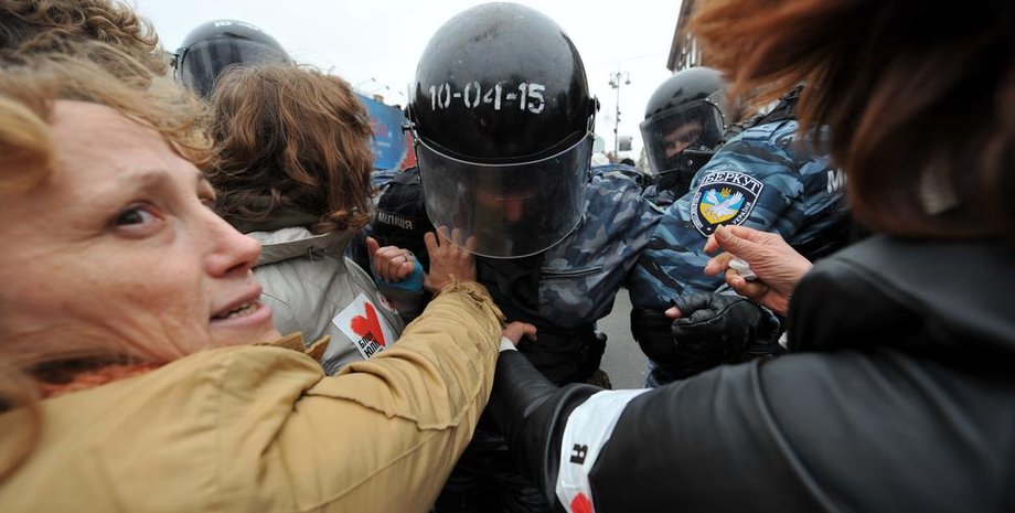 Сотрудники спецподразделения "Беркут" вступили возле Украинского дома в столкновение со сторонниками оппозиции, митингующими в защиту украинского языка