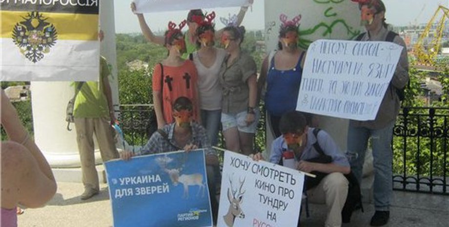 Небольшая группа горожан вышли на центральную улицу города Дерибасовскую в масках оленей и с плакатами Уркаина для зверей, Хочу смотреть кино про тундру на русском!, Янукович - наш герой и др.