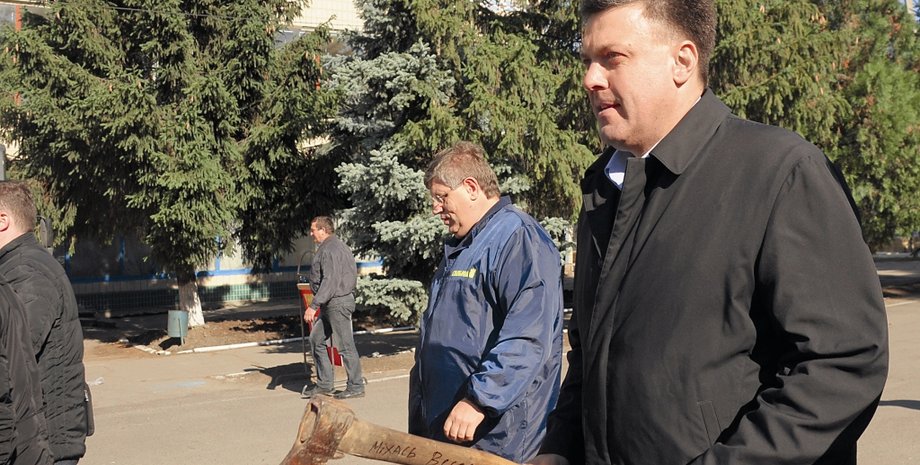Своих чаяний поклонники Тягнибока действительно не скрывают. В поселке городского типа Кривое Озеро в Николаевской области, где Тягнибок побывал в тот же день, что и в Балте, пожилой мужчина подарил свободовцу топор, чтобы тому было проще "работать" в парламенте.