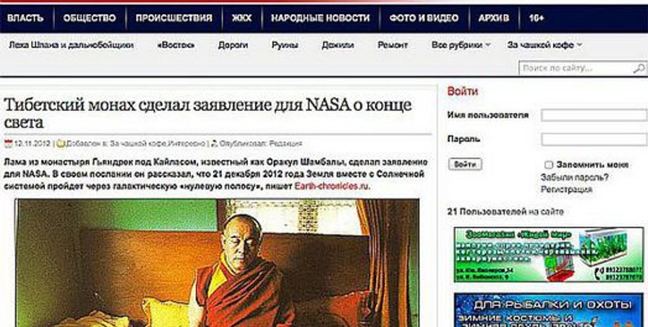 Статья под заголовком Тибетский монах сделал заявление для NASA о конце света, появившаяся в местной печати 14 ноября, заинтересовала население не столько прогнозом о конце света 21 декабря, о котором и без того известно из календаря индейцев майя, сколько своими практическими советами по спасению.