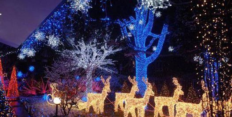 на свой дом различные новогодние украшения, а посреди сада поставил сани с