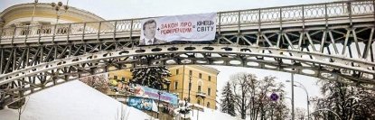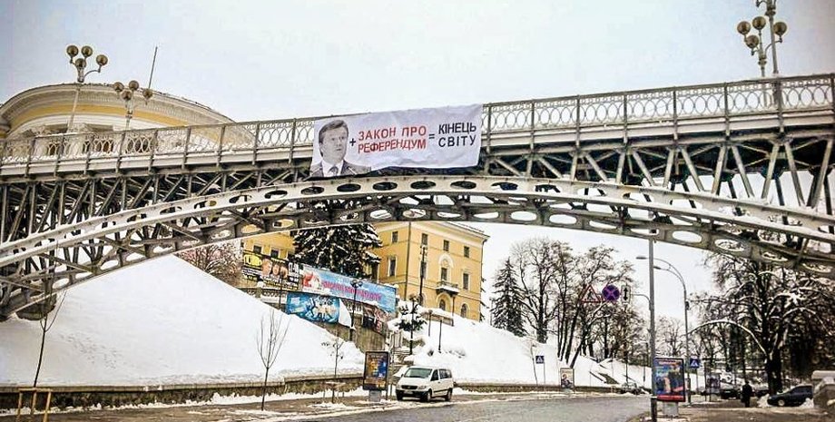 Изображения с текстом: "Янукович+закон про референдум = Конец света" были развешаны сегодня недалеко от Площади Независимости (на улице Институтской), проспекте Победы на Индустриальном мосту в Киеве.