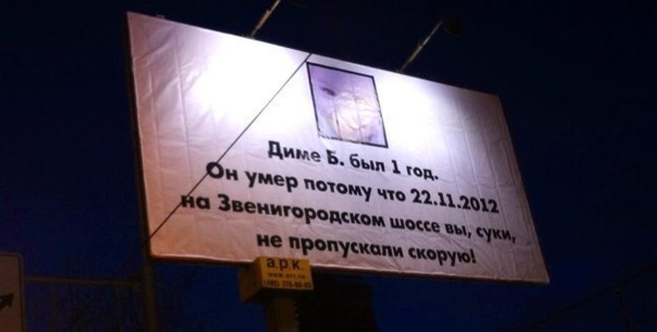 На оригинальном билборде было написано: "Диме Б. был год. Он умер потому что 22.11.2012 на Звенигородском шоссе вы, с***, не пропускали скорую".