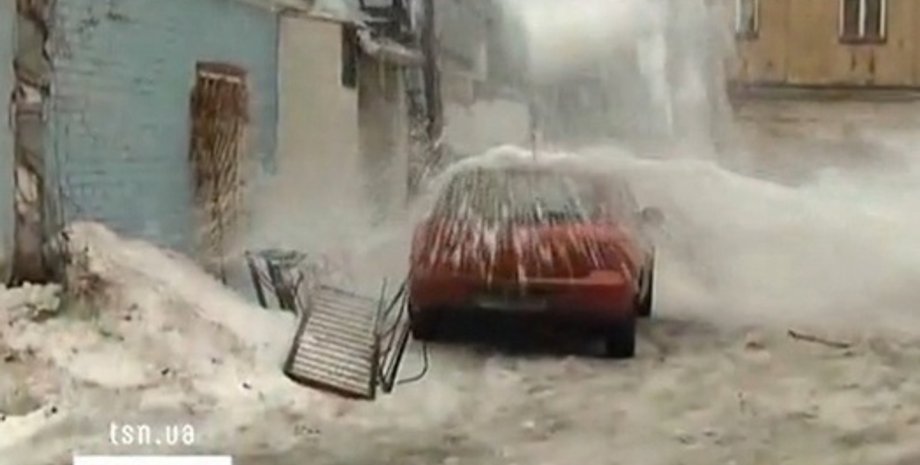 С крыши сначала сорвалась металлическая ограда, которая не выдержала снежную массу, передает ТСН.ua. Затем с крыши полетели сотни килограммов снега и льда, обрушившиеся на машину. Оператору ТСН удалось запечатлеть момент падания на видео: