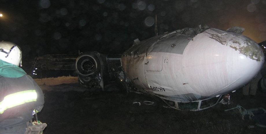 "13 февраля в 18:09 в международном аэропорту "Донецк" при осуществлении посадки пассажирский самолет Ан-24, совершавший рейс Одесса - Донецк, сошел за пределы взлетно-посадочной полосы, перевернулся и разломился пополам", - сообщается на сайте МЧС Украины.