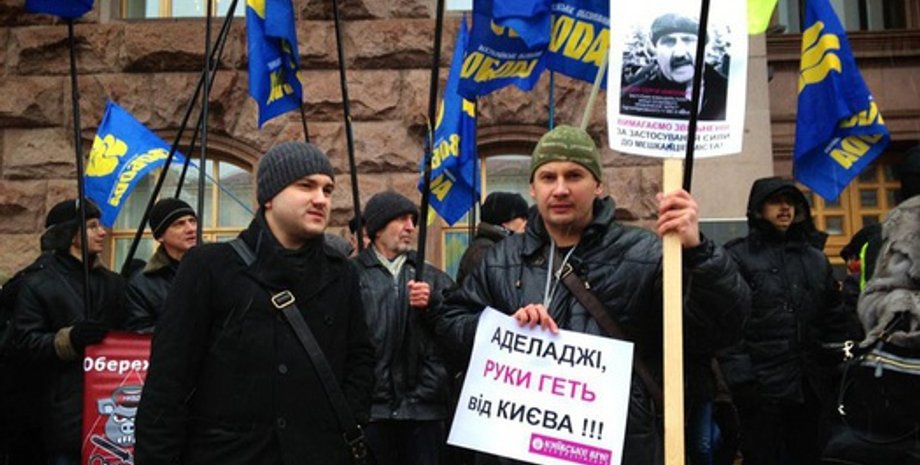 В частности по зданием КГГА находятся около 200 представителей ВО Свобода и общественной организации Наступ, они проводят Киевское вече.