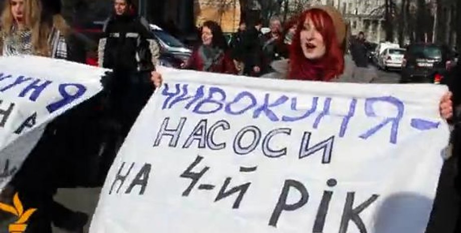 Митингующие держали в руках плакаты: "Чивокуня, go away" и выкрикивали аналогичные лозунги, пишет Радио Свобода.