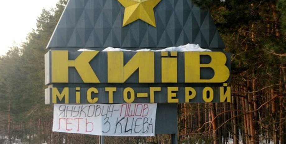 Сегодня, 27 февраля, по дороге в Межигорье, где находится резиденция Президента Украины Виктора Януковича, вывесили транспаранты с призывом к Президенту покинуть Киев.