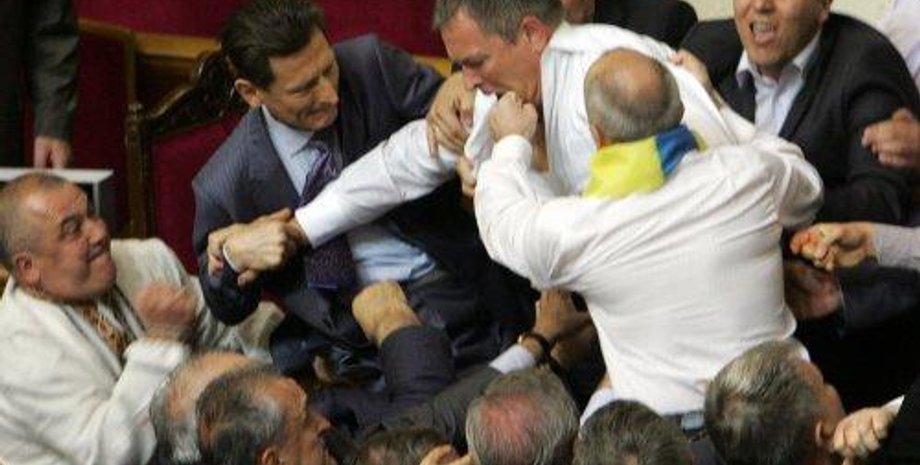Как сообщается, драка в парламенте началась во время выступления лидера ВО Свобода Олега Тягнибока.
