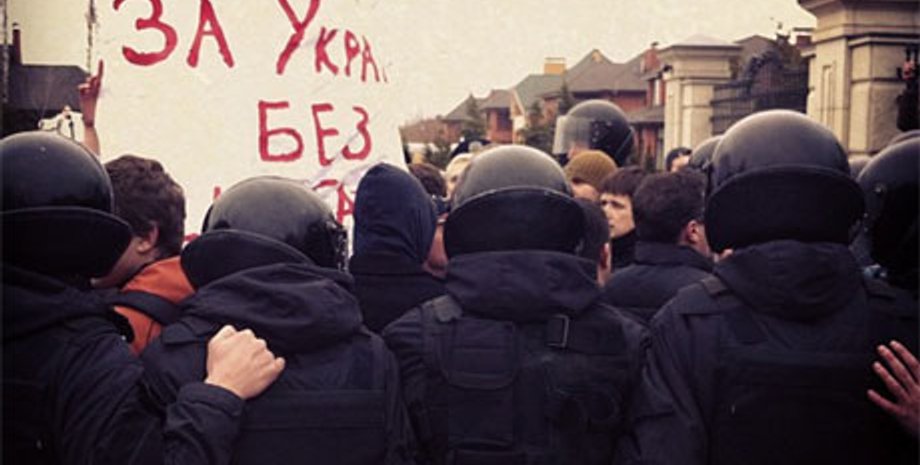 Бойцы Беркута окружили участников акции, прибывших под резиденцию Президента, в плотное кольцо.