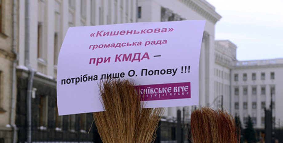 Одну из акций проводит Всеукраинская организация Киевское вече, которая требует отставки председателя столичной городской администрации Александра Попова, а также саморозпуска Киевсовета.