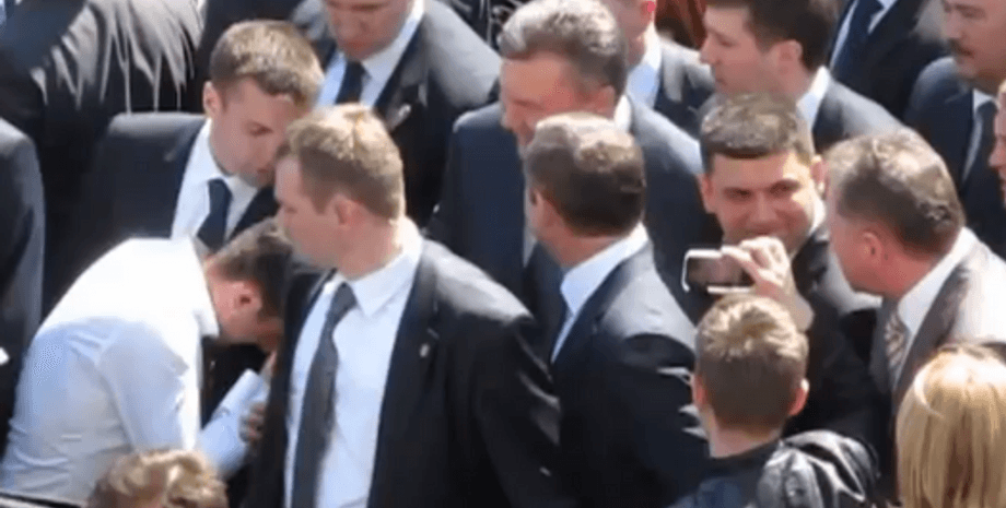Так, из снятого видно, как один из людей из толпы подходит к главе государства, рассказывает ему о чем-то, а на прощание целует руку и прижимает ее ко лбу. В ответ на это Президент улыбнулся, а охранники оттолкнули собеседника Януковича.