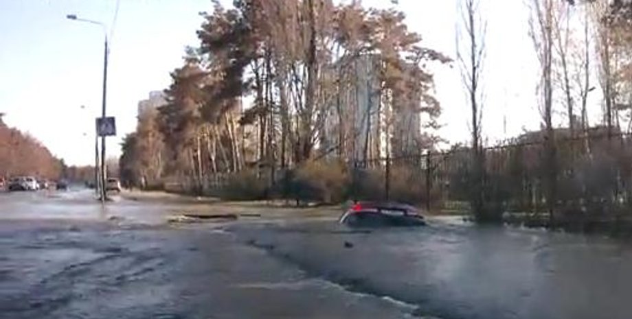 Cегодня, 22 апреля, в Днепровском районе Киева по ул. генерала Жмаченко припаркованный на тротуаре автомобиль Hyundai Grandeur провалился под асфальт из-за прорыва холодного водоснабжения в яму глубиной в два метра