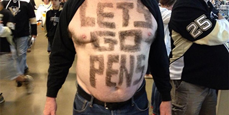 В США болельщик команды NHL Питтсбург Пингвинс выразил свою любовь к клубу, выбрив на своем теле надпись Lets Go Pens.