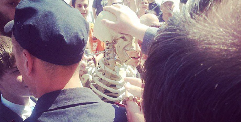 По его словам, активисты принесли и оставили скелет около 2-го подъезда Верховной Рады.
