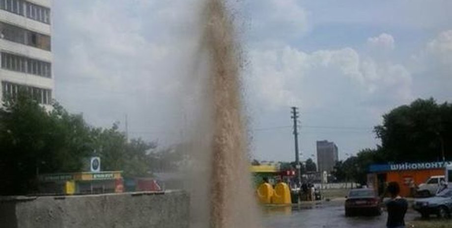 В Киеве на массиве Радужный возле жилого дома прорвало трубу с горячей водой, в результате чего из-под земли забил фонтан кипятка, сообщила местная жительница.