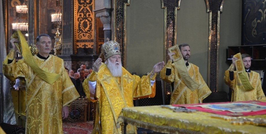 Литургию возглавляет предстоятель Украинской православной церкви Киевского Патриархата, Патриарх Киевский и всей Руси-Украины Филарет.