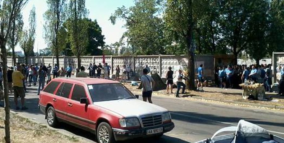 Призывы повалить забор звучат от молодых людей (около 20), которые с целью остаться неузнаваемыми надели на лица медицинские маски. Несколько наиболее активных уже предприняли попытку закрепить на вбитый в забор крюк веревку, чтобы опрокинуть его.