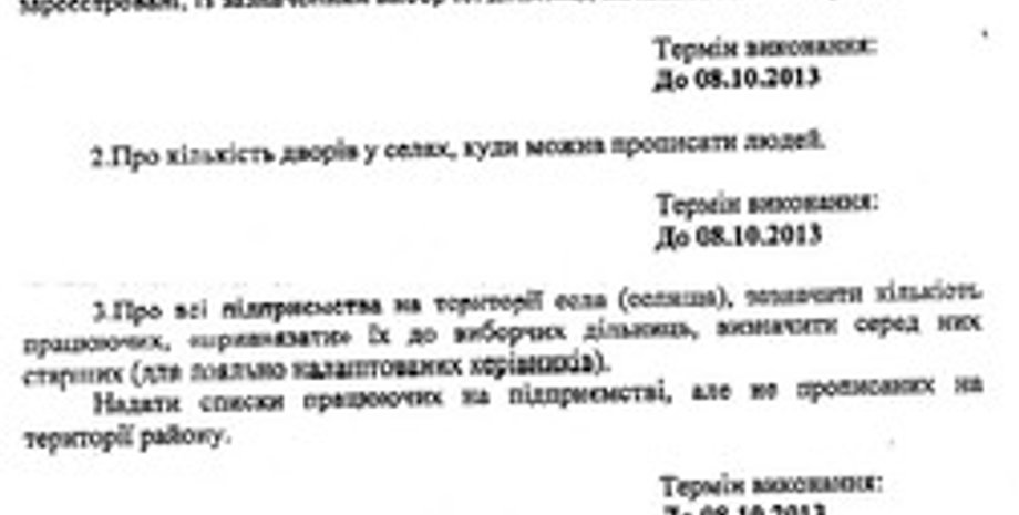 Кроме того, от глав советов требуют данные о предприятиях и количестве работников, а также просят назначить среди них главных для сотрудничества. Другие категории - данные об общежитиях и зарегистрированных избирателях. Отдельный пункт - просьба узнать о проблемах, которые беспокоят граждан, как, например, ремонт дорог или строительство объектов.