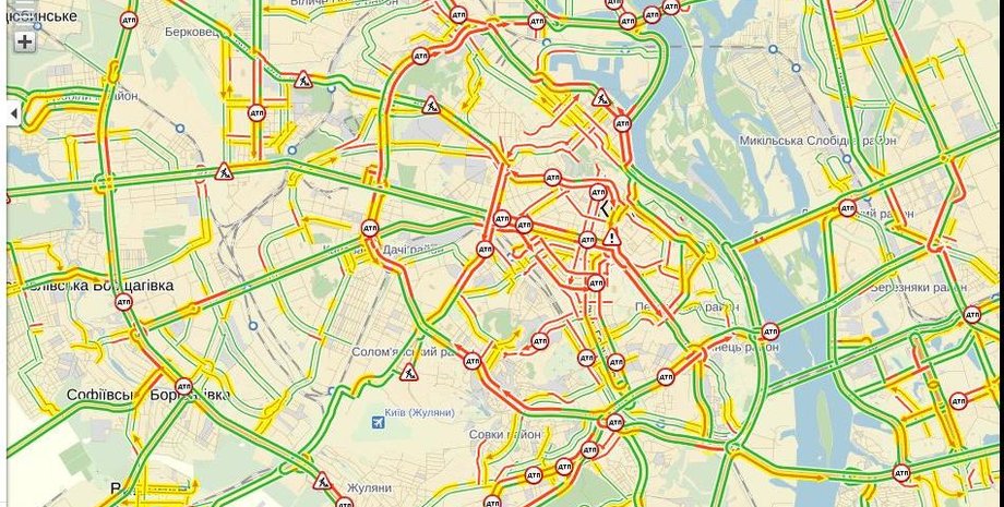 Больше всего затруднен проезд в центре, средняя скорость передвижения достигает 5 км/ч. Кроме того, дороги заблокированы на Березняках, там произошла авария. Еще три ДТП рядом с ремонтом дорог мешают проезду в Жулянах.