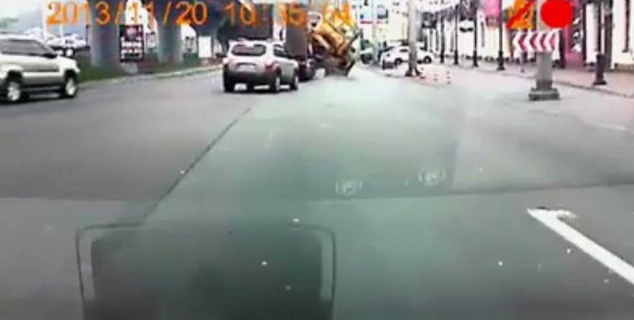 Сегодня, 20 ноября, в Подольском районе Киева произошло ДТП с участием грузового автомобиля, перевозившего гусеничный бульдозер.
