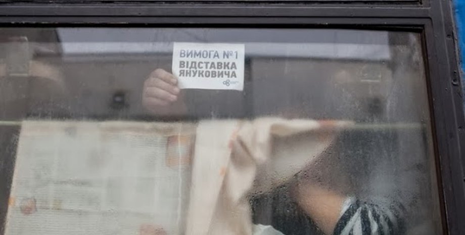 В связи с этим по пути следования в Запорожье антимайдановцы организовали своеобразный бунт: срывали стоп-краны и били стекла. Однако, самом интересным оказалось то, что люди прилепили к стеклам вагонов стикеры с надписью "Вимога №1 - відставка Януковича!"