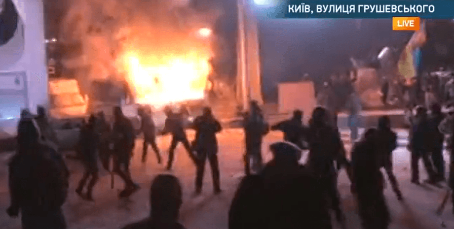 Автобус правоохранителей, который стоит на ул.Грушевского возле стадиона "Динамо", пылает в полную силу