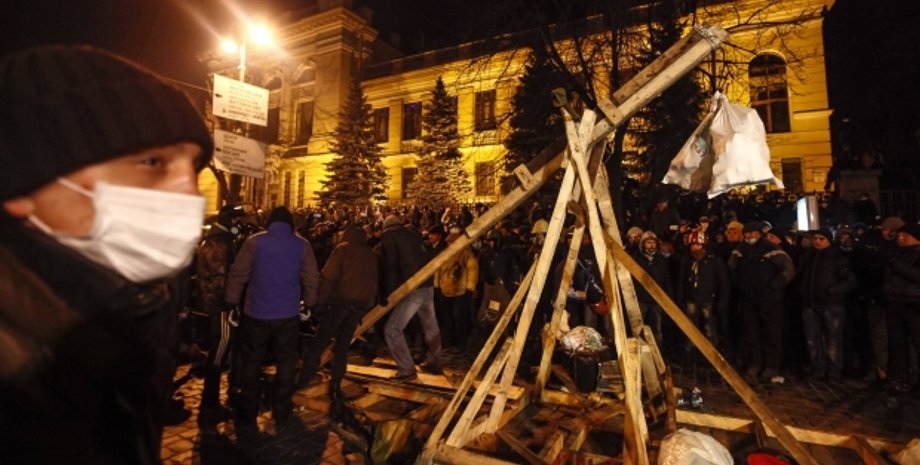 В понедельник вечером протестующие соорудили катапульту, чтобы метать камни в правоохранителей, которые преградили путь в правительственный квартал Киева