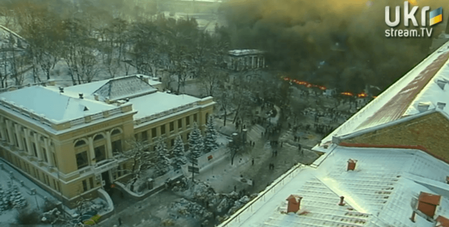 Территория окутана черным дымом от горящих автомобильных шин.Как передает "Интерфакс-Украина", в настоящее время на ул.Грушевского находятся около 300 митингующих. Они не предпринимают активных действий, лишь периодически бросают камни в сторону силовиков. В ответ изредка летят светошумовые и газовые гранаты.