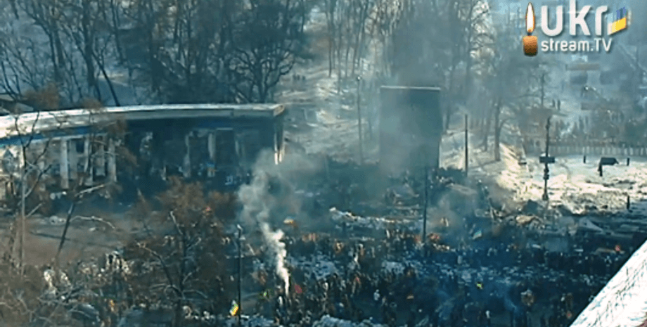 В первом ряду баррикад, возле сгоревших автобусов, около сотни митингующих. Они греются возле костров, оставшихся от горящих шин. Иногда митингующие подбрасывают шины, поддерживая огонь.